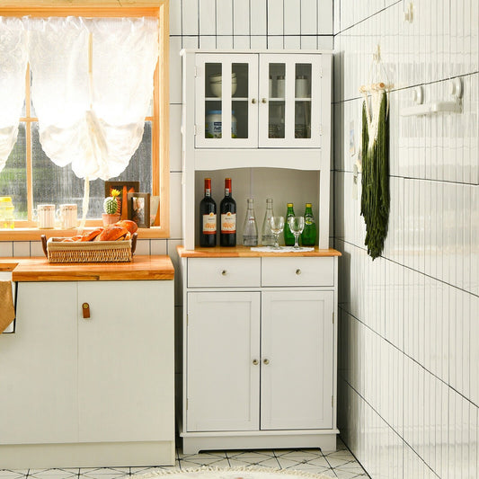 Kitchen Pantry Cabinet with Wood Top and Hutch-White