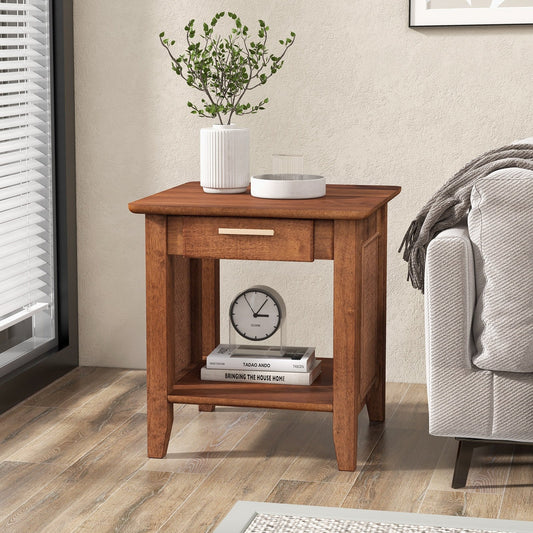 Rattan Nightstand End Table with Drawer and Storage Shelf-Walnut