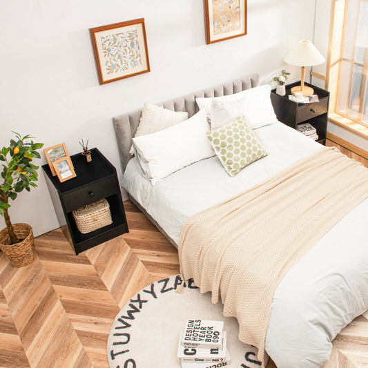 Set of 2 Nightstand with Drawer Cabinet End Side Table Raised Top-Black