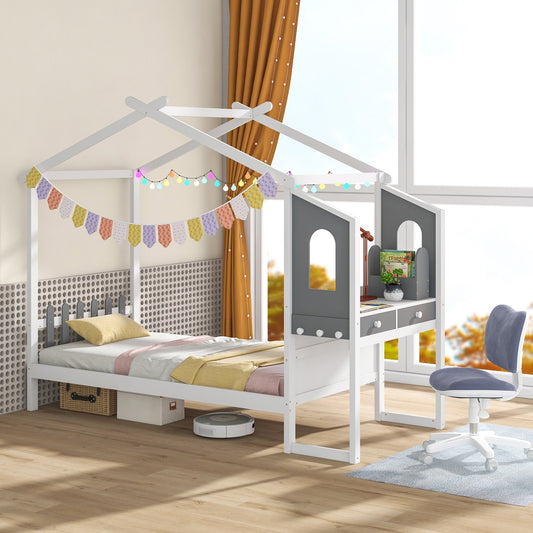 Twin/Full Bed Frame with House Roof Canopy and Fence for Kids-Twin Size