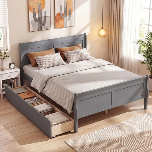 Queen Size Bed Frame with 2 Storage Drawers and Footboard-Gray