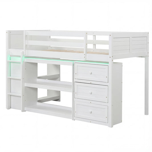 Twin Size Kids Loft Bed with LED Lights and Removable Bookcase-Gray