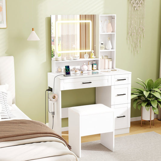 Dressing Desk with 3 Color Lighting and Hair Dryer Stand-White