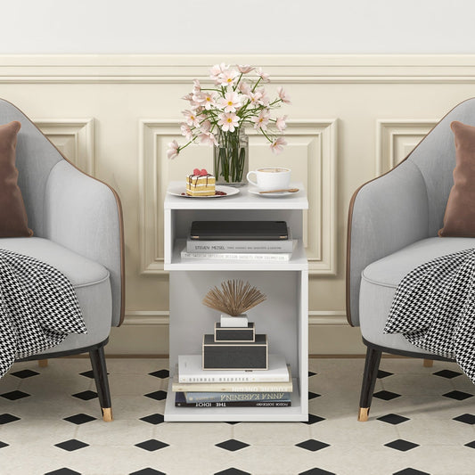 S-Shaped Side Table with Unique S-shaped Frame and 2 Open Compartments-White
