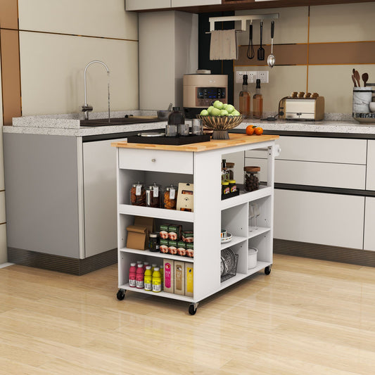 Kitchen Island Trolley Cart on Wheels with Storage Open Shelves and Drawer-White
