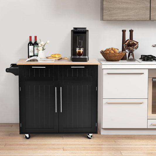 Kitchen Island Trolley Wood Top Rolling Storage Cabinet Cart with Knife Block-Black