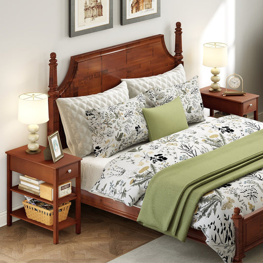 3-Tier Narrow End Table with Drawer and Storage Shelves Set of 2-Brown