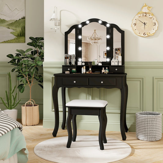 Makeup Vanity Table Set with Lighted Mirror and Drawers-Black