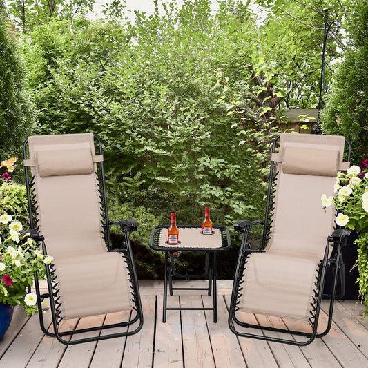 3 Pieces Folding Portable Zero Gravity Reclining Lounge Chairs Table Set-Beige
