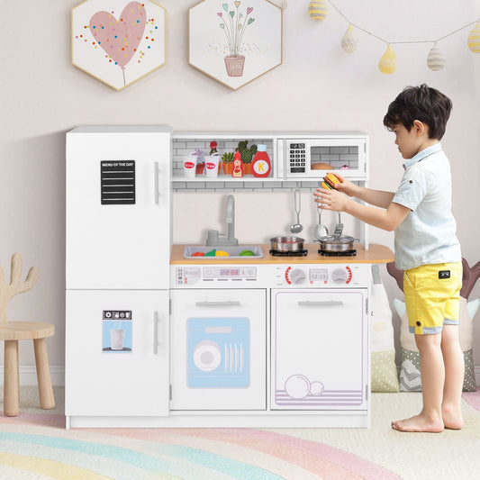 Wooden Kids Kitchen Playset with Chalkboard Ice Maker Sink Lighted Microwave-Pink