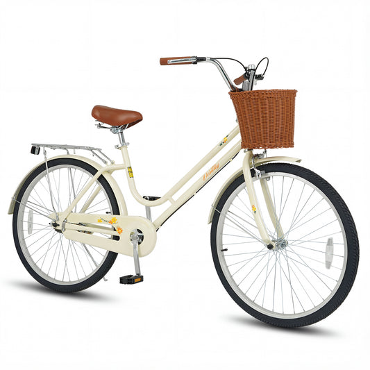 24 Inch Beach Cruiser Bike for Women with Woven Basket and Rear Rack - Beige