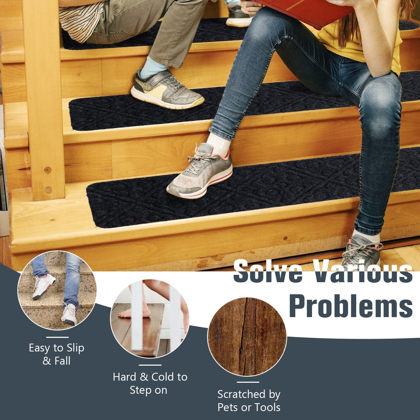 ● Easy Installation: It only takes few minutes to install all the 15 stairway carpets. What you need to do is just cleaning the stair surface with a soft and damp cloth removing the protective plastic film on the back and applying them to your stairs. It is recommended to keep 0.39" to 0.78" away from the edge.