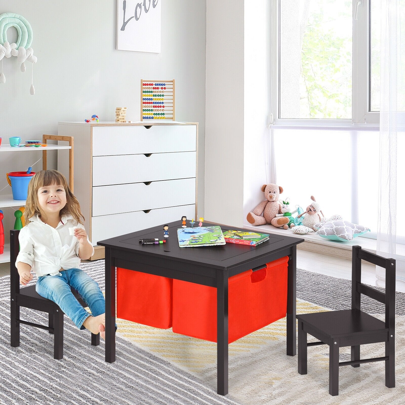 ● Includes one table with under-the-table storage drawers and two chairs