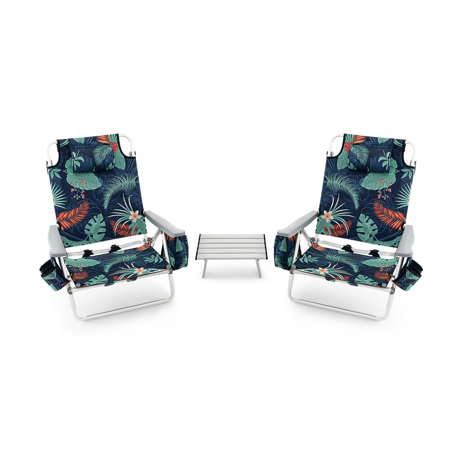 The solid steel frame is sturdy enough for long term use and 5 reclining positions are designed to satisfy your different needs. Besides soft headrest and widened armrest can relax your body and bring you a comfortable sitting experience. The lightweight design with folding design allows you to take it anywhere you want and it will occupy less space when not in use. Plus it also comes with cup holders ice pack storage bag and towel rack for convenient use. And the foldable side table offers more space to place your items. This 3-piece beach chair and table set allows you to enjoy the beautiful ocean view and share the happy moments with your friend or family.