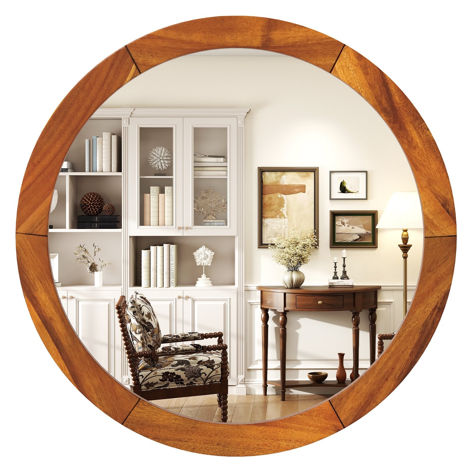 27 Inch Round Wall Mirror with Solid Acacia Wood Frame-Brown