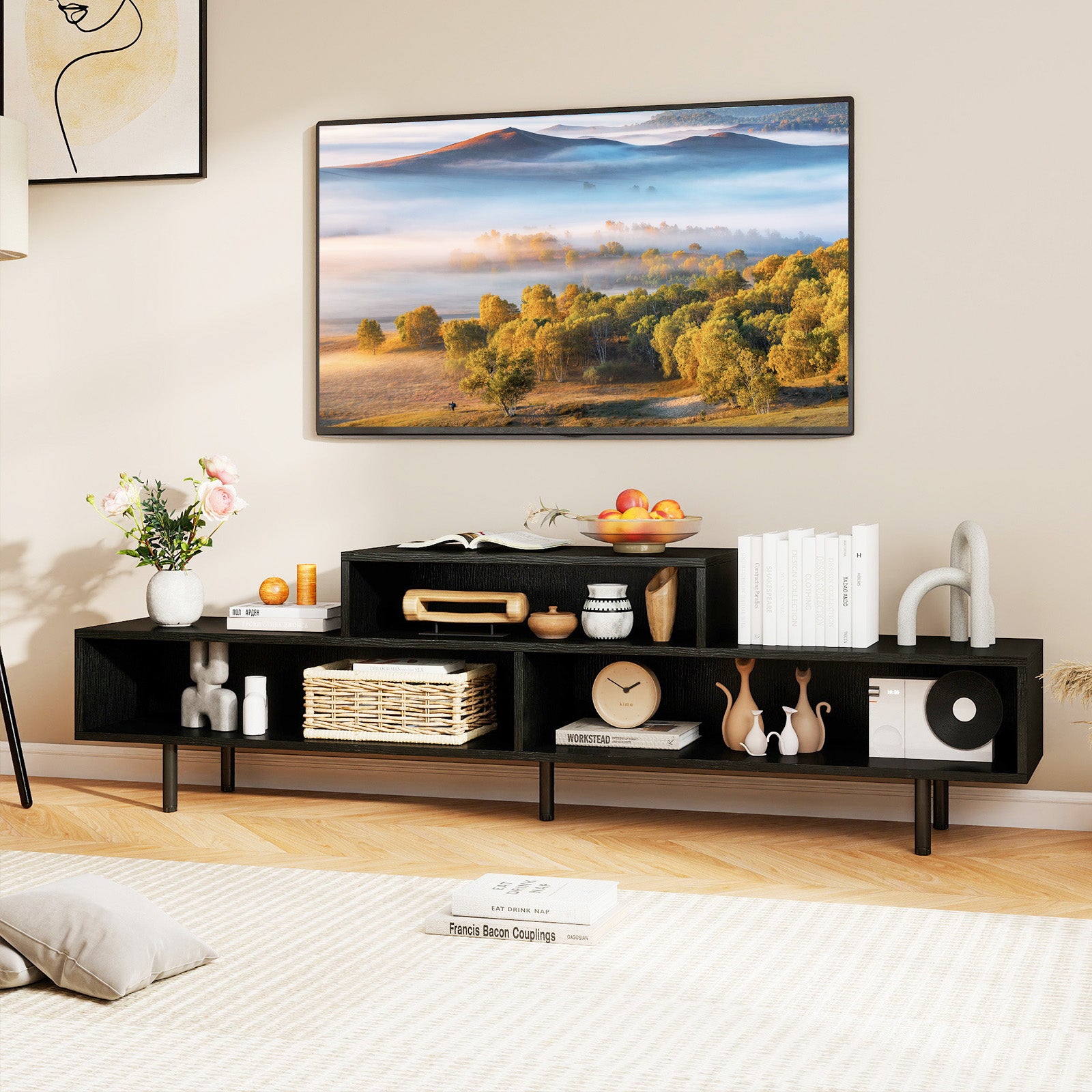 ● Raised Metal Legs: Equipped with 5 sturdy elevated metal support legs this media console table ensures exceptional stability and durability. The raised design provides better weight distribution and makes floor cleaning a breeze.