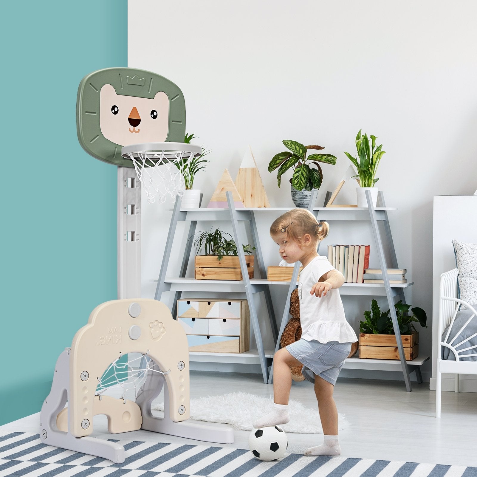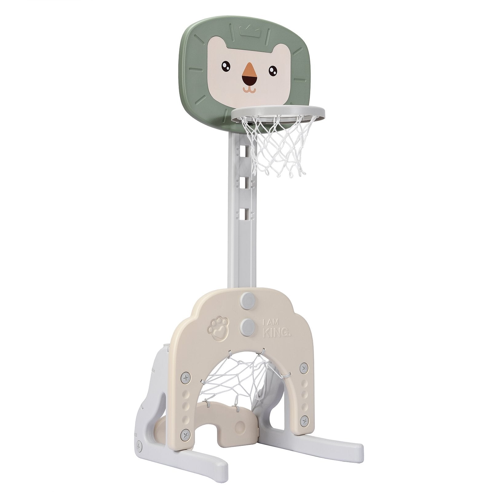 ● 3-in-1 Activity Center: This kid's basketball hoop has three sports to play including golf games basketball games and soccer goal games. It also comes with 1 basketball 1 soccer ball 2 golf balls and 1 golf club. By playing by themselves or with friends children can gain unlimited joy and develop motor skills!