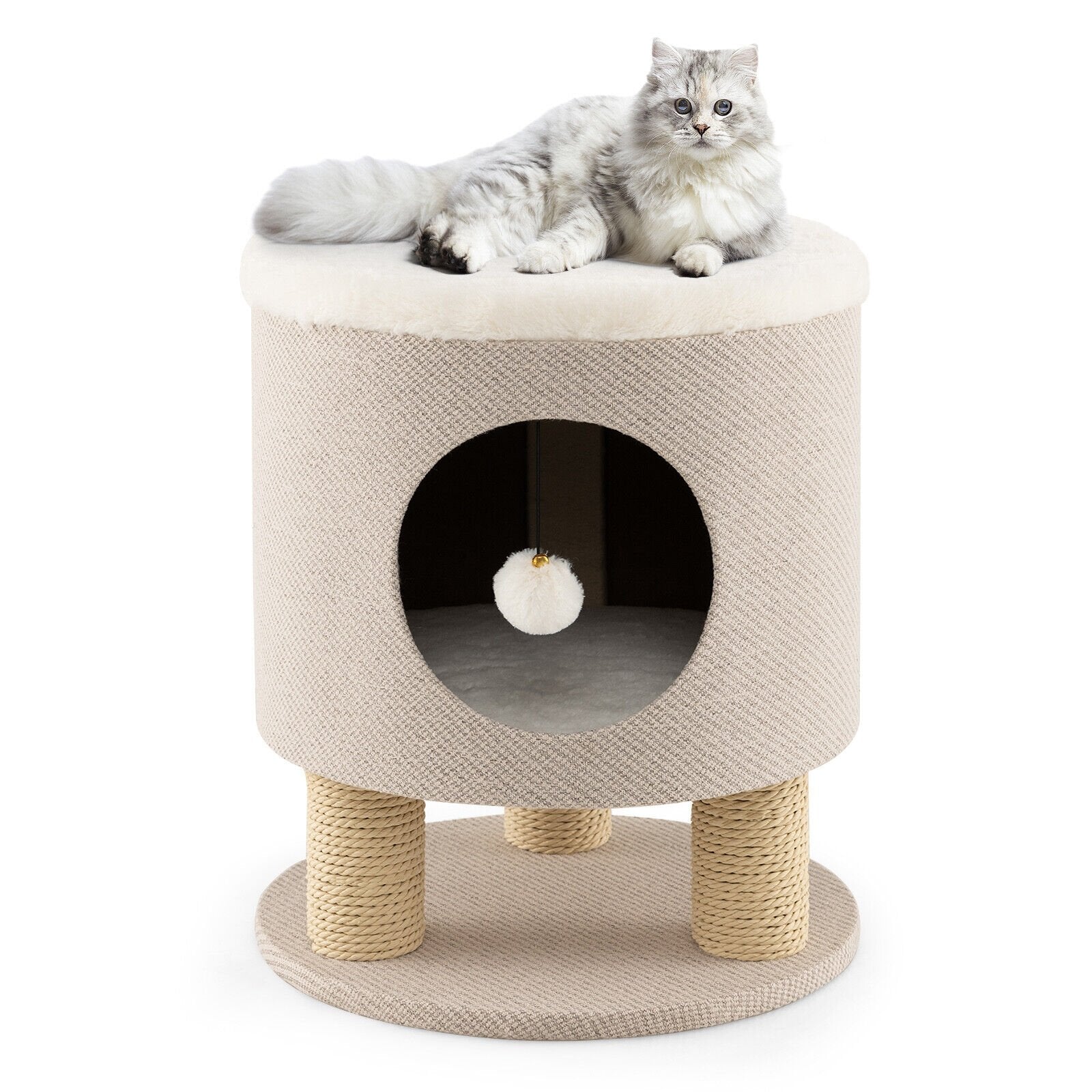 3-in-1 Cat Condo Stool Kitty Bed with Scratching Posts and Plush Ball Toy-Beige