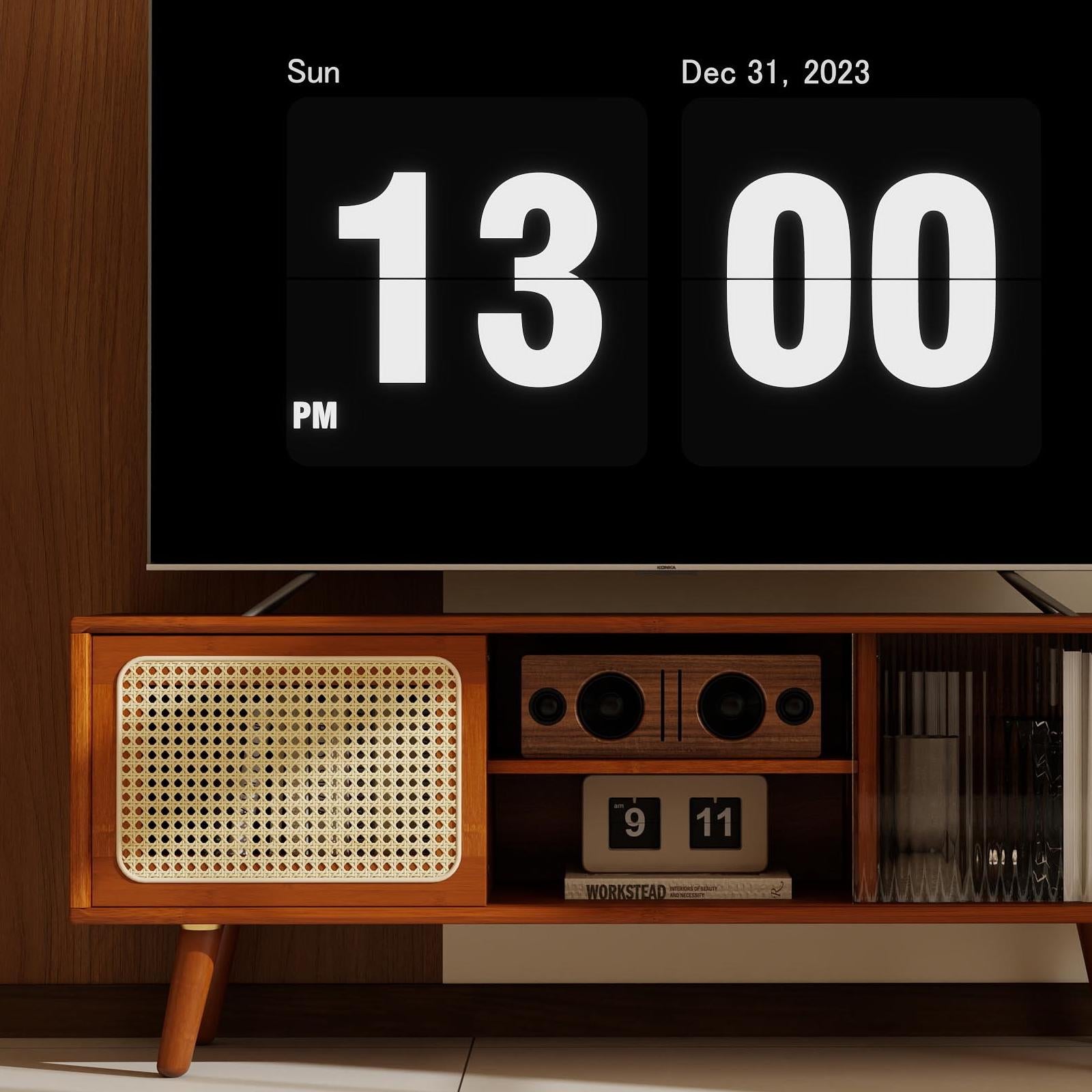 ● TV Stand with Rattan and Glass Sliding Doors: The entertainment console features rattan panels complemented by sliding glass doors creating a blend of privacy and style. Behind the doors is concealed storage for media components while the top surface supports your TV and decorations.
