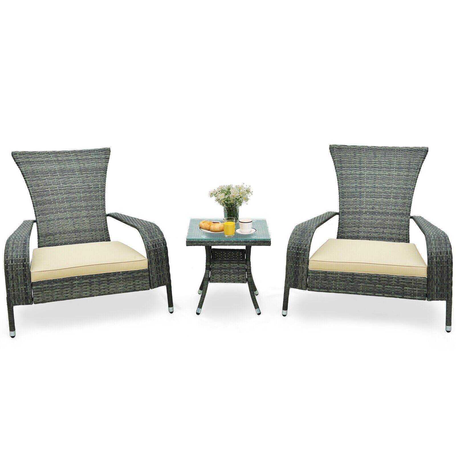 3-Piece Wicker Adirondack Set with Comfy Seat Cushions-Gray
