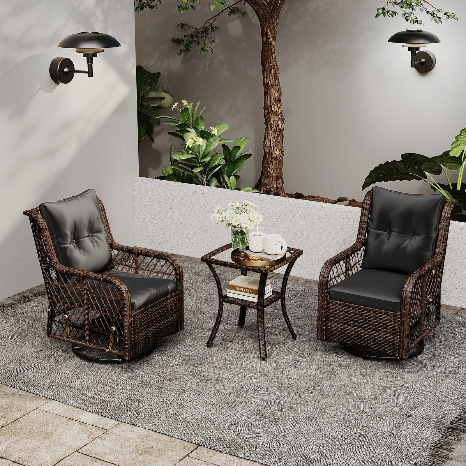 3 Pieces Patio Furniture Set PE Wicker Swivel Glider Chairs with 2-Tier Side Table and Cushions-Black