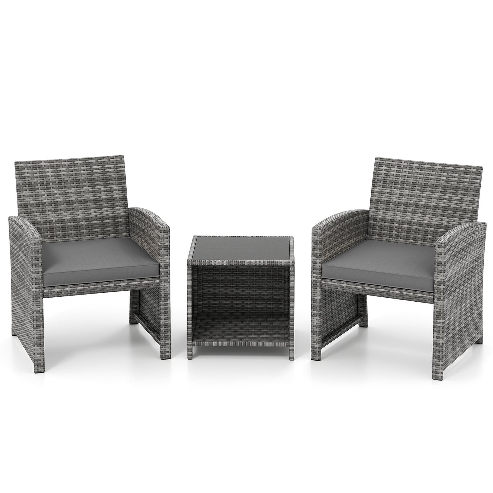 3 Pieces Patio Furniture Set with Tempered Glass Coffee Table and Soft Seat Cushions-Black