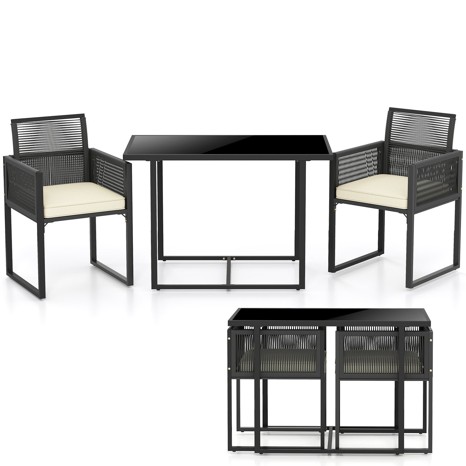 ● Space-saving Design: This 3-piece compact patio set frees up space when not in use. Effortlessly fold the chair backrests place the cushions on the back and tuck the 2 chairs neatly under the table.