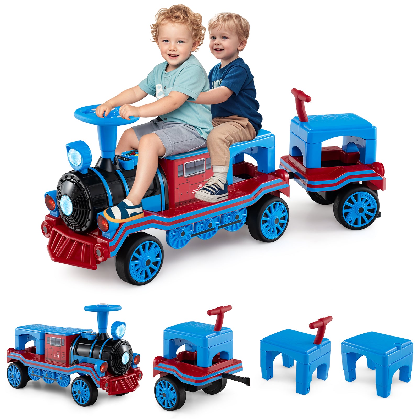 ● Easy-to-connect locomotive and carriage offer 2+1 seats for kids
