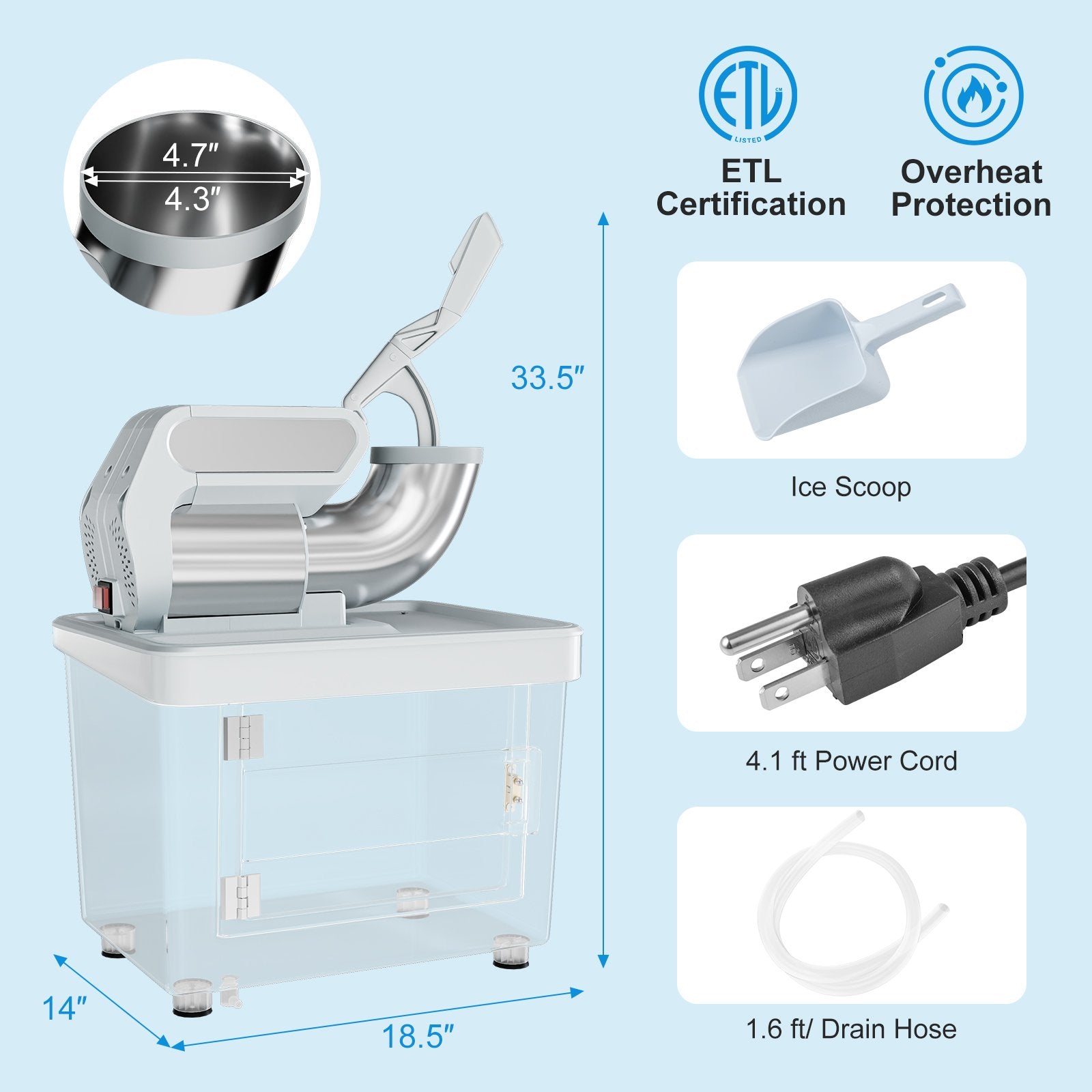 ● Safe and Simple to Operate: The waterproof switch allows you to operate this ETL-approved snow cone maker easily and safely. It will stop running when the plunger is pulled out of the hopper for security. Besides the overheat protection makes it automatically shut down as well if the inner components reach 266℉.