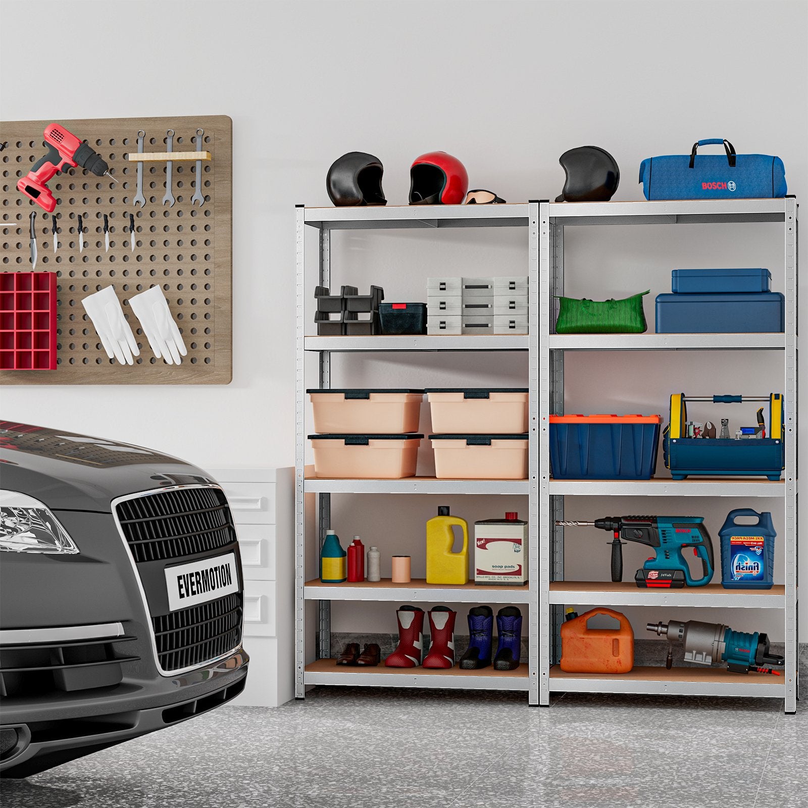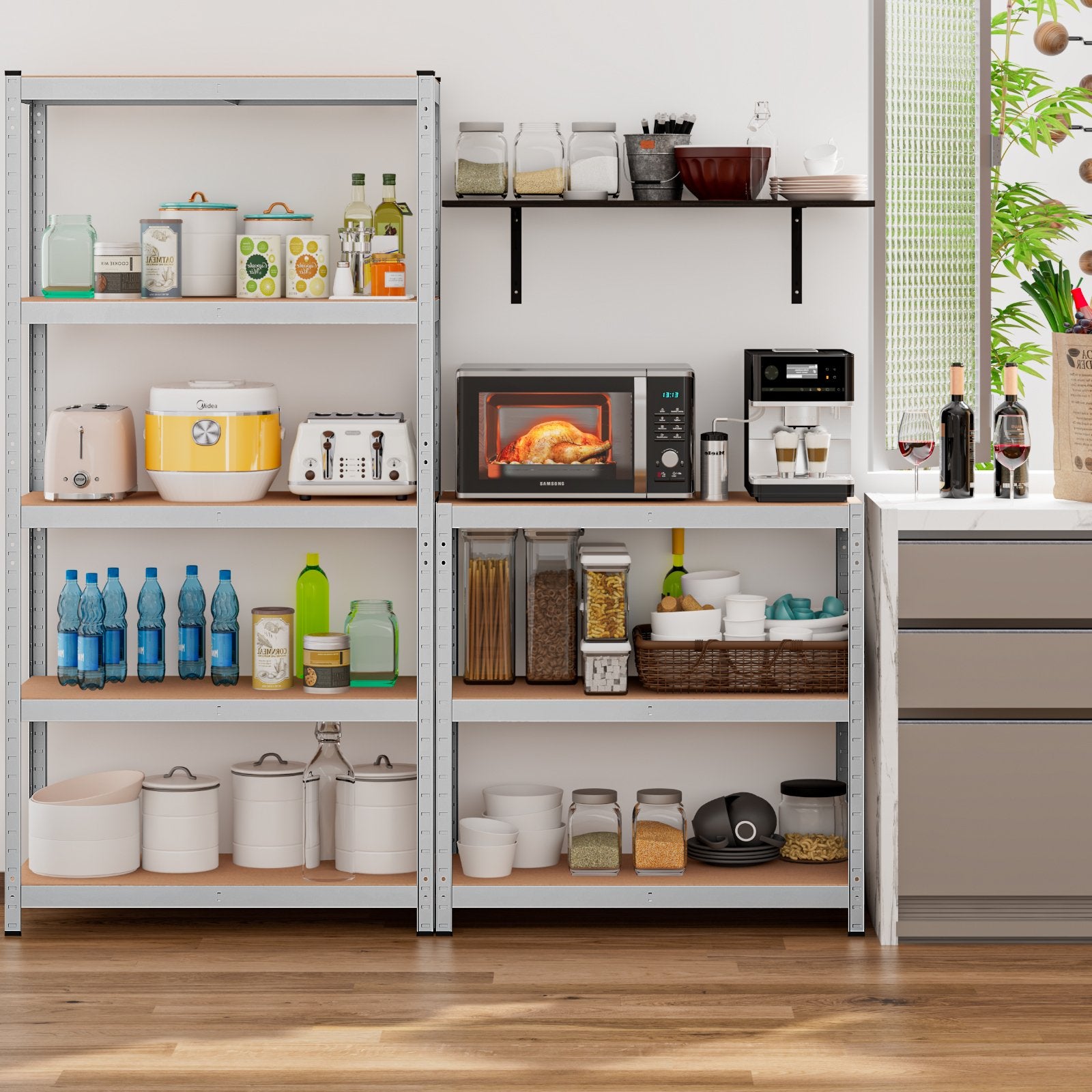 ● Multifunctional 5-tier Metal Shelves: 5-tier Shelving unit is extremely useful in organizing your tools foods books or other stuff especially great for any place where has limited room while requires large storage space such as a bathroom doorway entryway garage kitchen pantry laundry office etc.