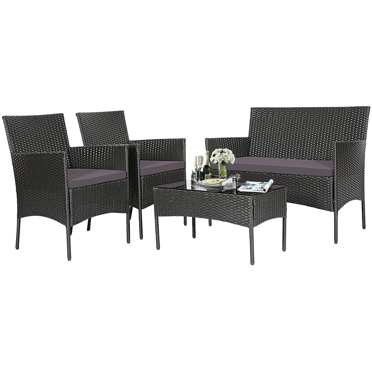 4 Pieces Patio Rattan Cushioned Sofa Set with Tempered Glass Coffee Table-Gray