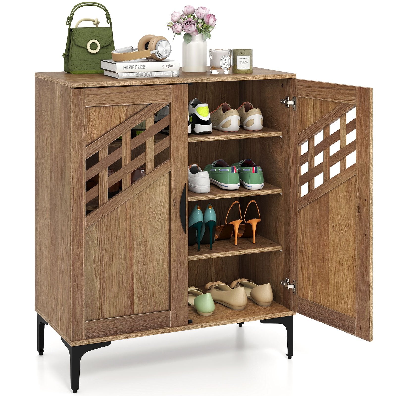 4 Tier Farmhouse Shoe Storage Cabinet with Removable Shelves and Metal Legs-Oak