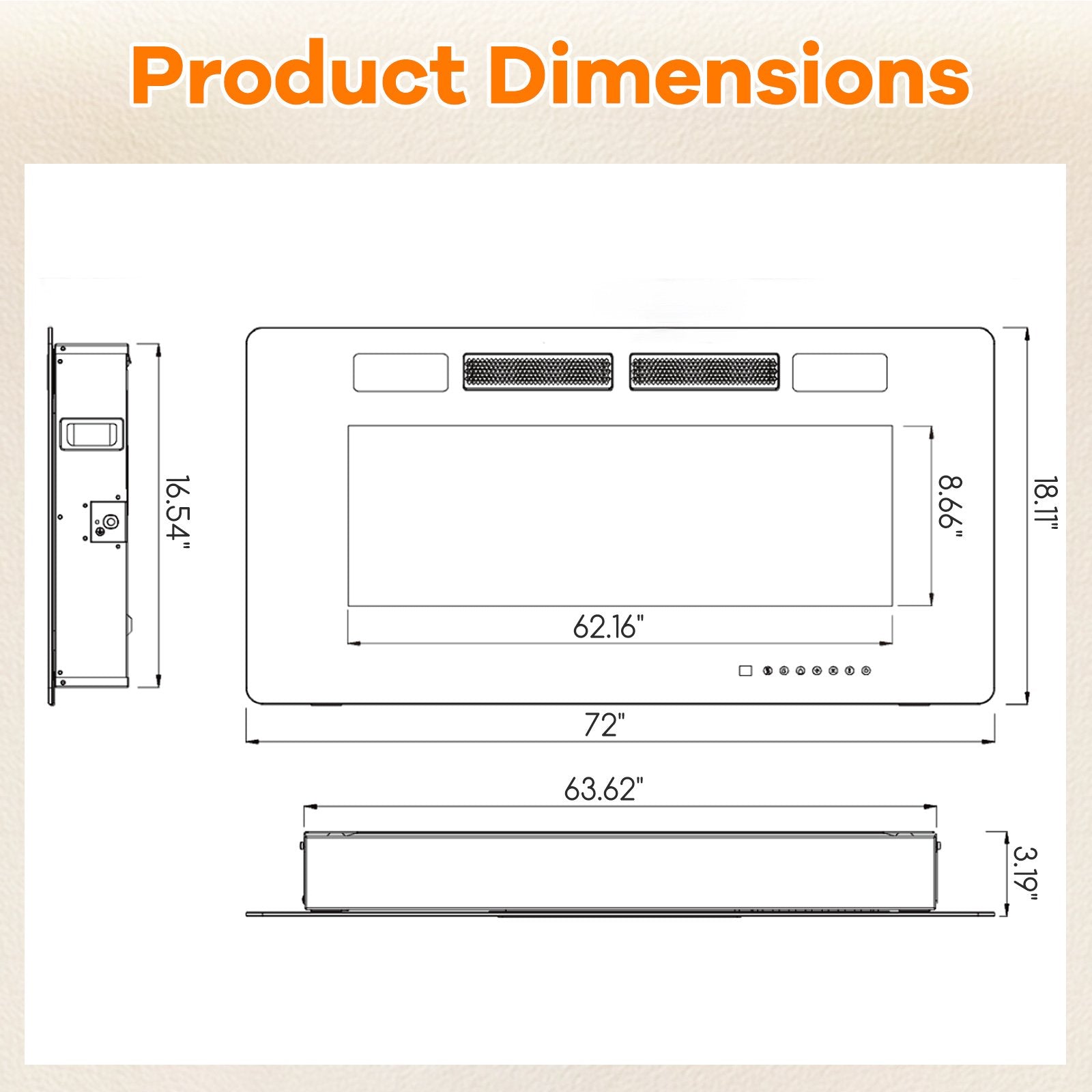 ● 2 Installation Methods: With 3.19” thickness this ultra-thin fireplace add a touch of sleek to your indoor occasions. This electric fireplace not only can be recessed in wall but also can be wall-mounted with the included preinstalled mounting bracket. Please do not cover the air outlet and leave at least 8 inches of space around the electric fireplace.