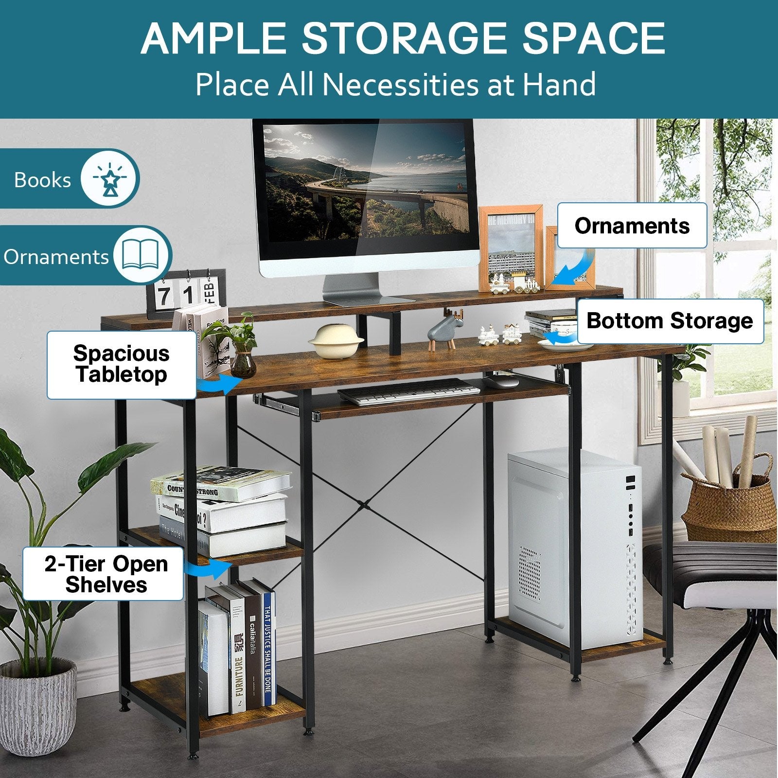 ● Spacious Storage Space: The computer desk featuring 2-tier open storage shelves CPU stand monitor riser and keyboard tray which provides large storage space for your daily work and study to keep your room as tidy as possible. All of the documents books or decorations are always in reach.