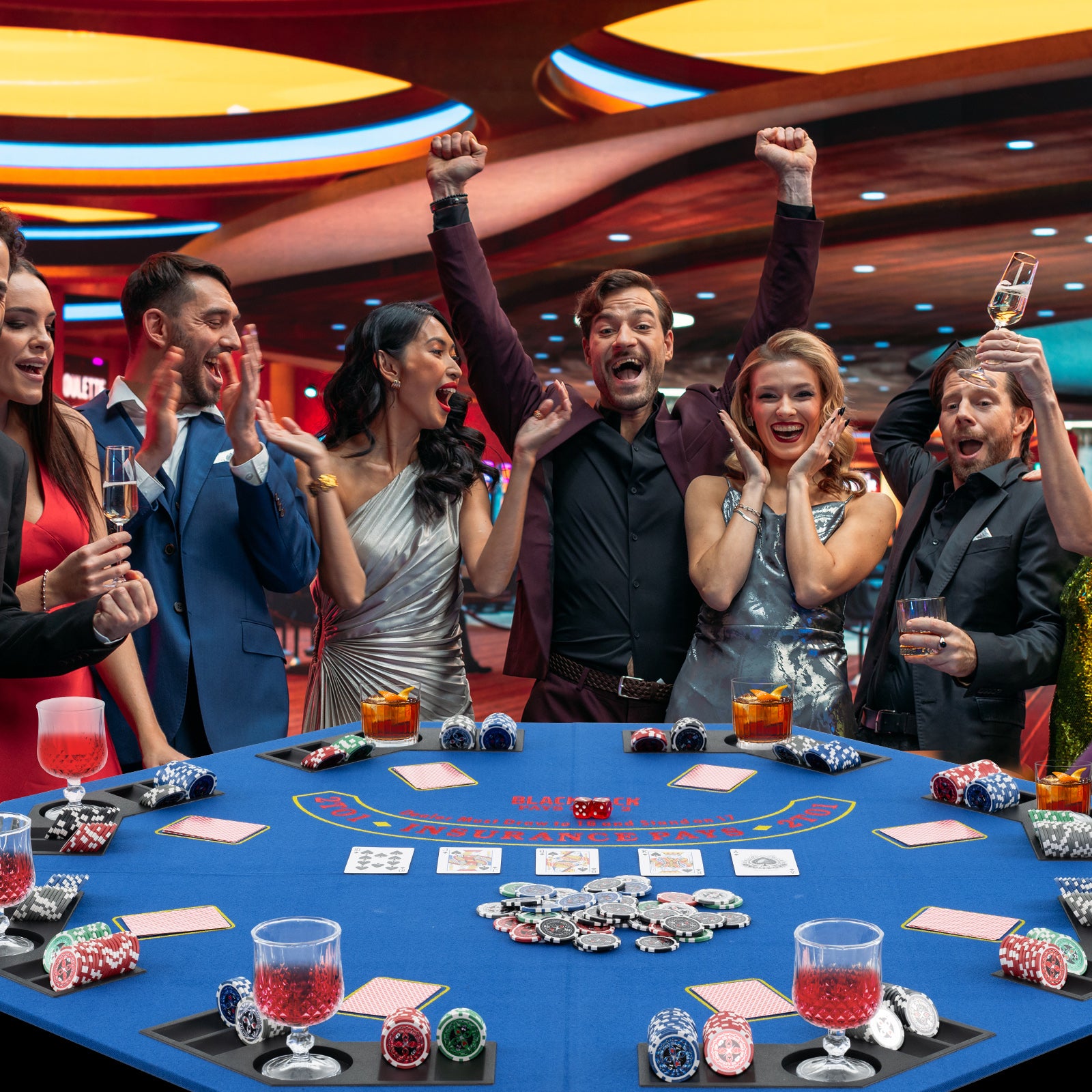 ● Professional Gaming Experience: To create an authentic casino atmosphere right in your own home the blackjack poker table mat is designed with dedicated areas for card placement individual cup holders to keep drinks secure and integrated poker chip trays for organized gameplay.