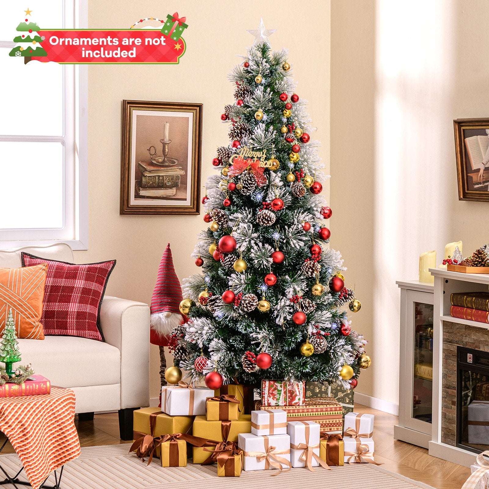 ● Winter Wonderland: The 7 ft Xmas tree stands out with 270 branch tips glistening with flocked pine needles. Besides the tree boasts 30 clusters of lovely red berries and 30 realistic natural pine cones creating a winter wonderland right in your space.