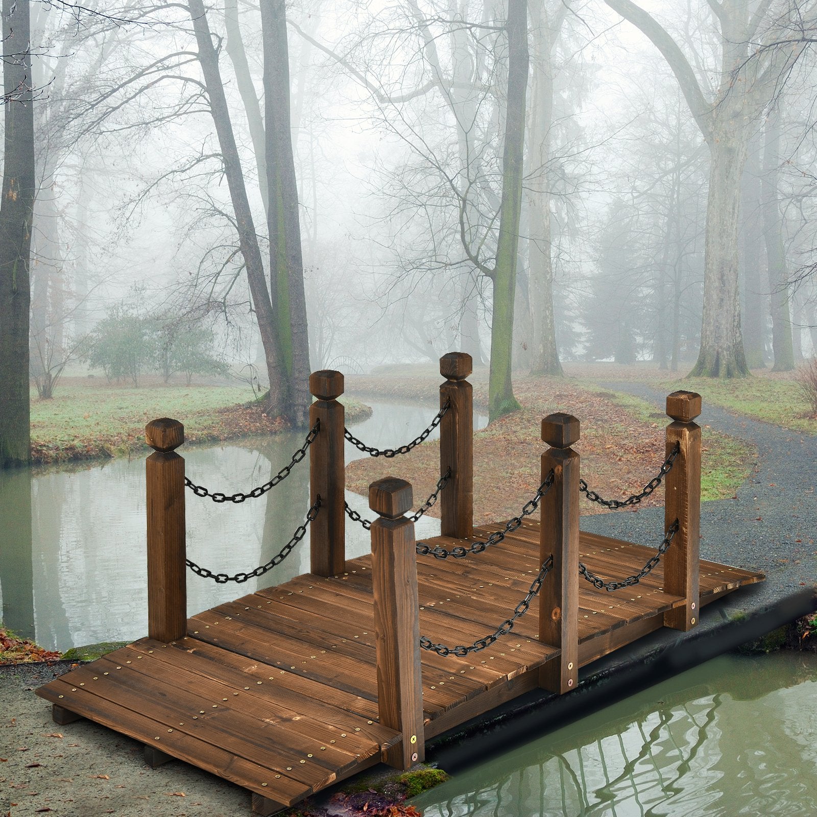 5 Feet Wooden Garden Bridge Arc Footbridge Stained Finish Walkway with Safety Rails