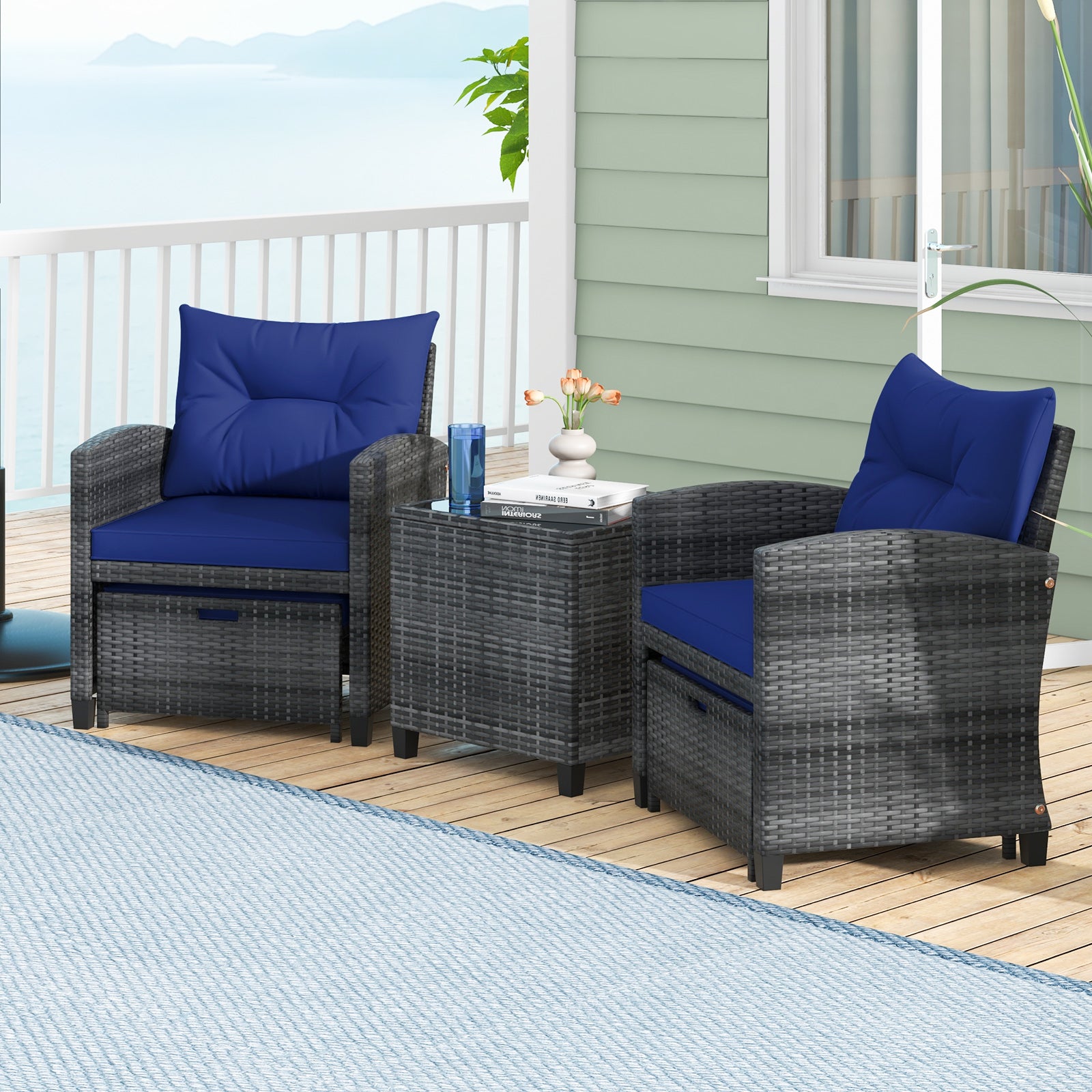 ● Awesome Relaxing Choice: As a perfect blend of coziness and elegance this 5-piece outdoor wicker set will be an awesome addition to backyard poolside front porch and so on. Dimension of chair: 26" x 25.5" x 30" (L x W x H). Dimension of ottoman: 21" x 20" x 11" (L x W x H). Dimension of coffee table: 20" x 20" x 20" (L x W x H).