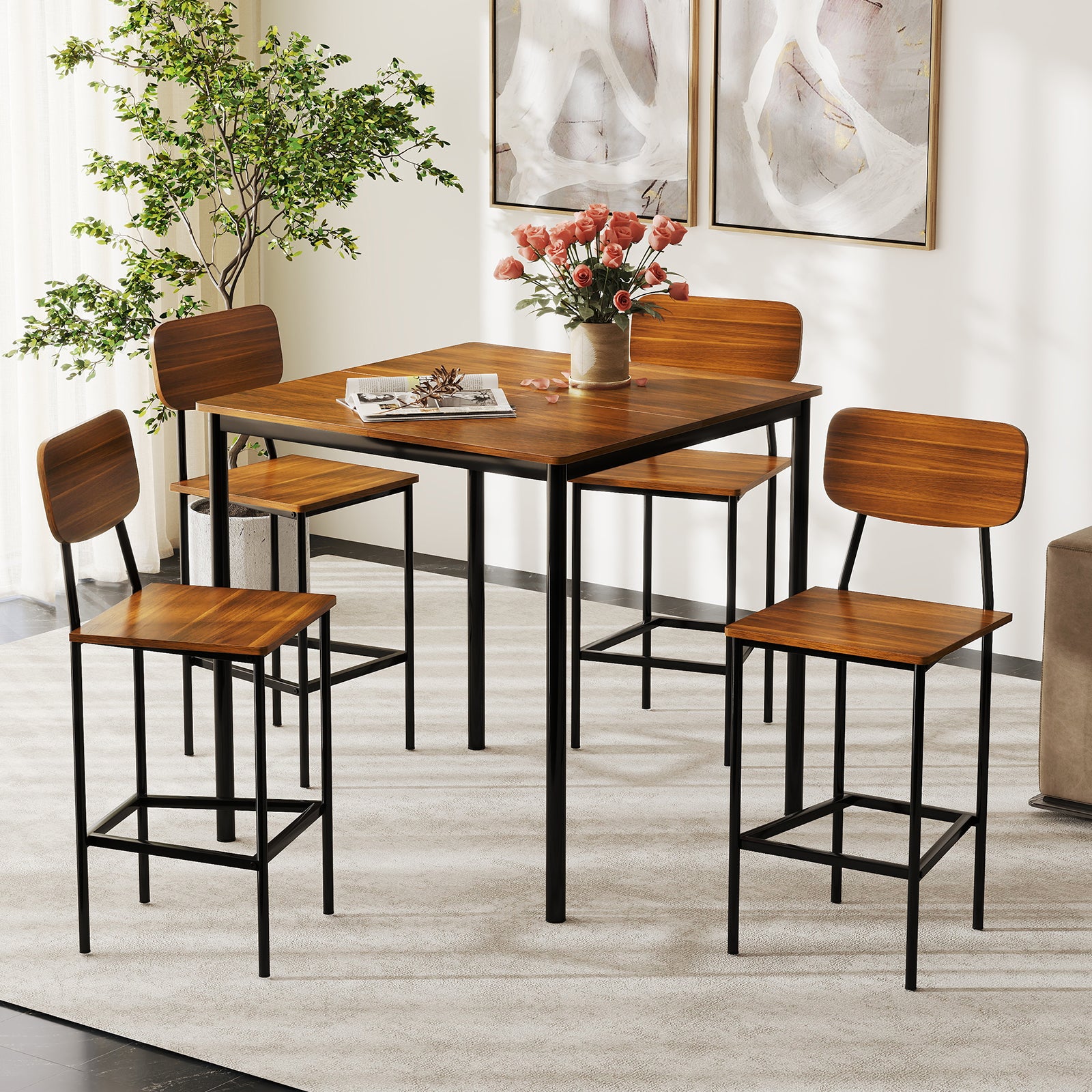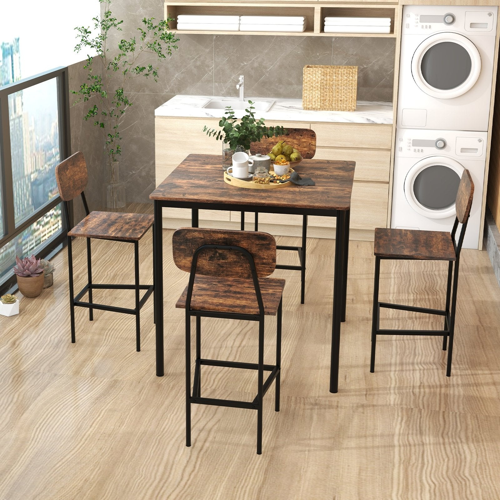 5 Pieces Industrial Dining Table Set with Counter Height Table and 4 Bar Stools-Coffee