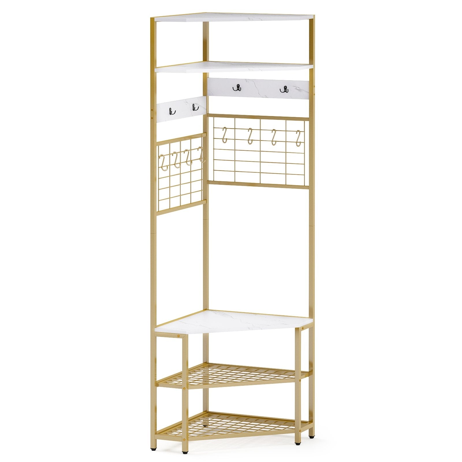 ● Space-saving Corner Design: The entryway clothes rack features a right-angle design to fit neatly in corners maximizing space usage. It presents a sleek and organized look with ample storage on each tier.