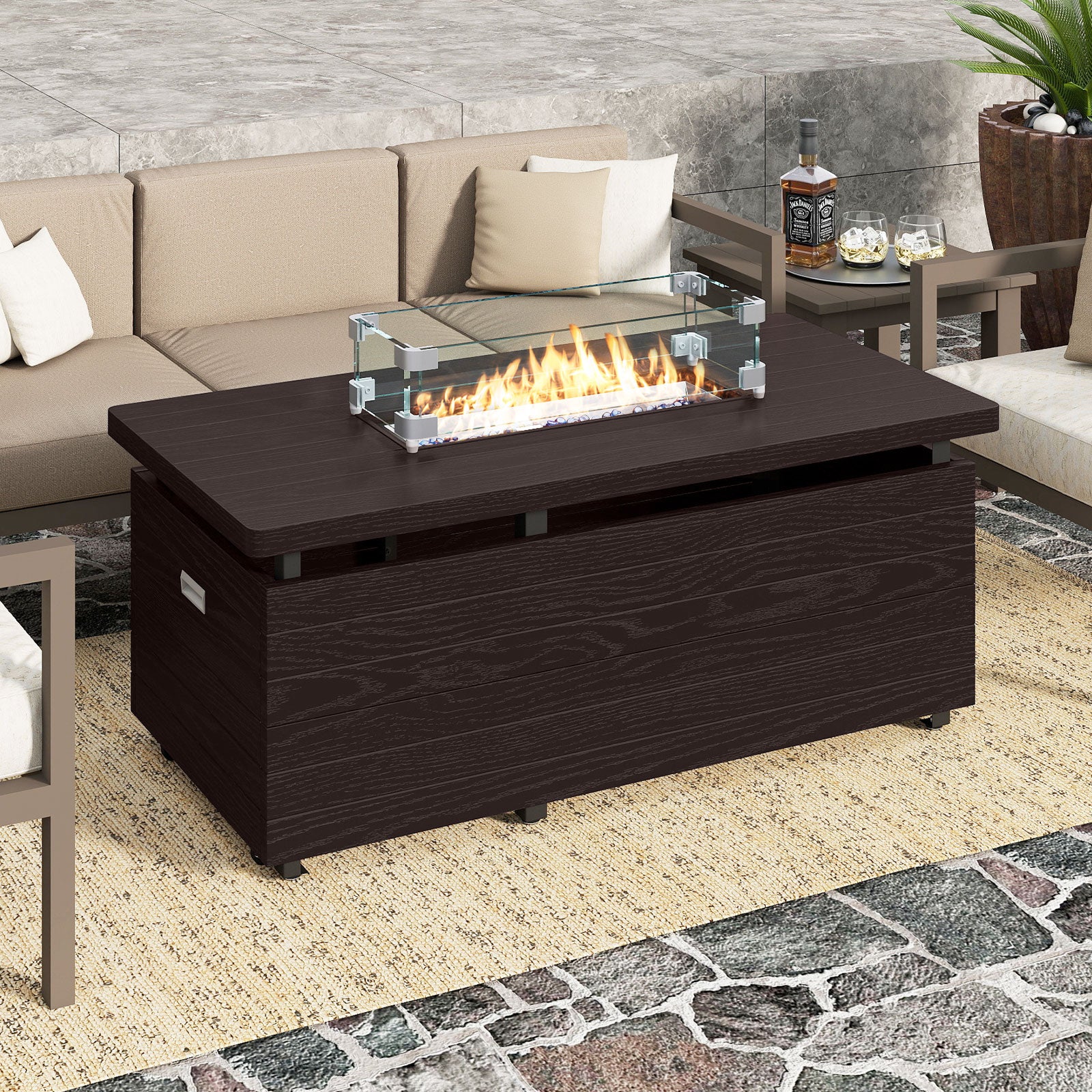 ● 2-in-1 Convertible Design: Serving dual purposes this rectangular fire pit table effortlessly converts into a stylish coffee table with a removable lid facilitated by a convenient pull ring. The included oxford cloth cover offers protection when the gas fire pit is not in use. Note: Please wait until the fire pit table is fully cool before covering.