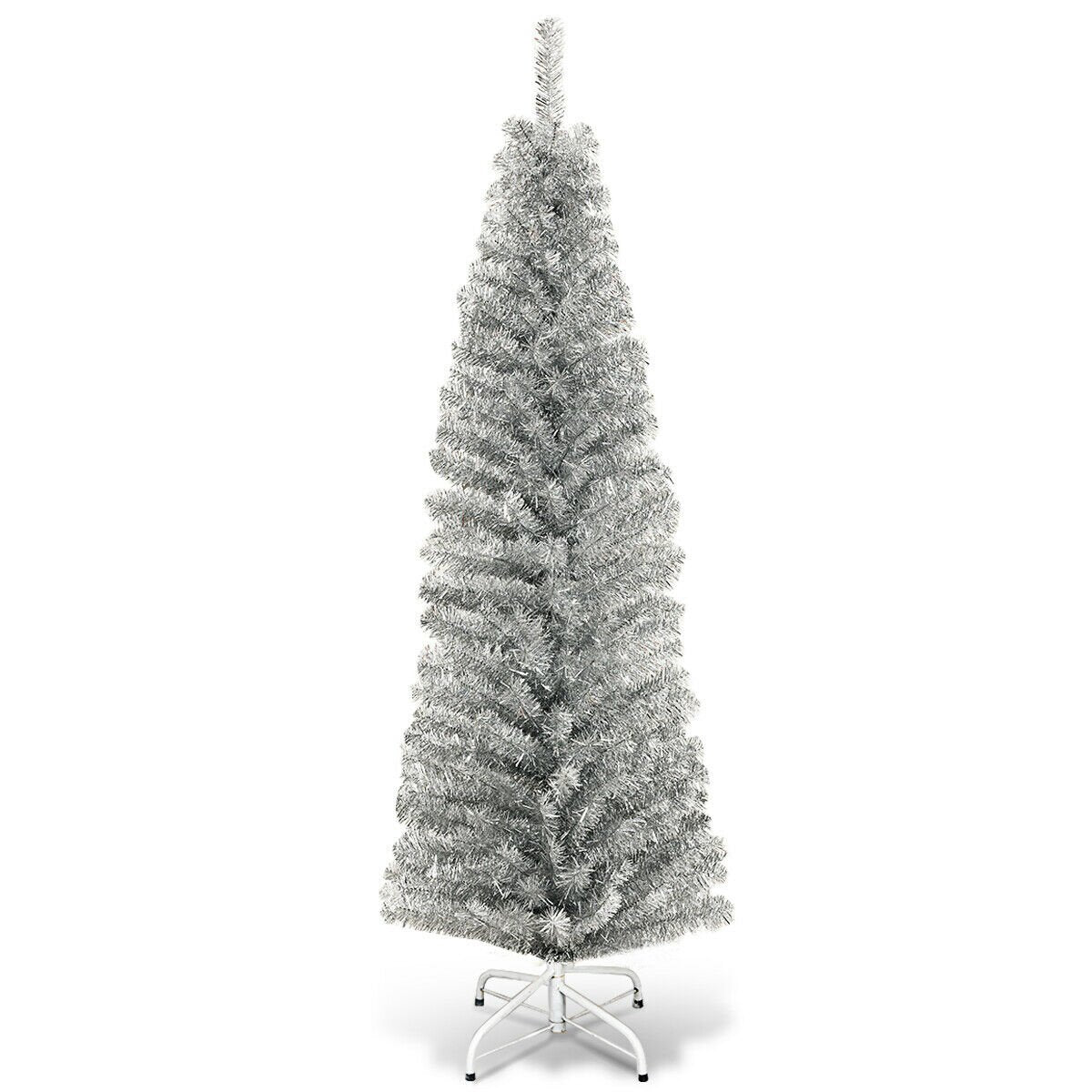A simple Christmas tree allows you to decorate it freely with Christmas stockings colored balls lights or other ornaments according to your own preferences. Slim pencil shape design makes the tree take up less space to suitable for any narrow place. Foldable X-shaped iron stand prevents breakage and enhances the balance of the tree offering stability to keep the wondrous tree standing all year round. Whether for your home courtyard or for commercial places like shops the distinctive silver tinsel tree is the perfect eye-catching decoration to add multiple fun and festive holiday fullness!