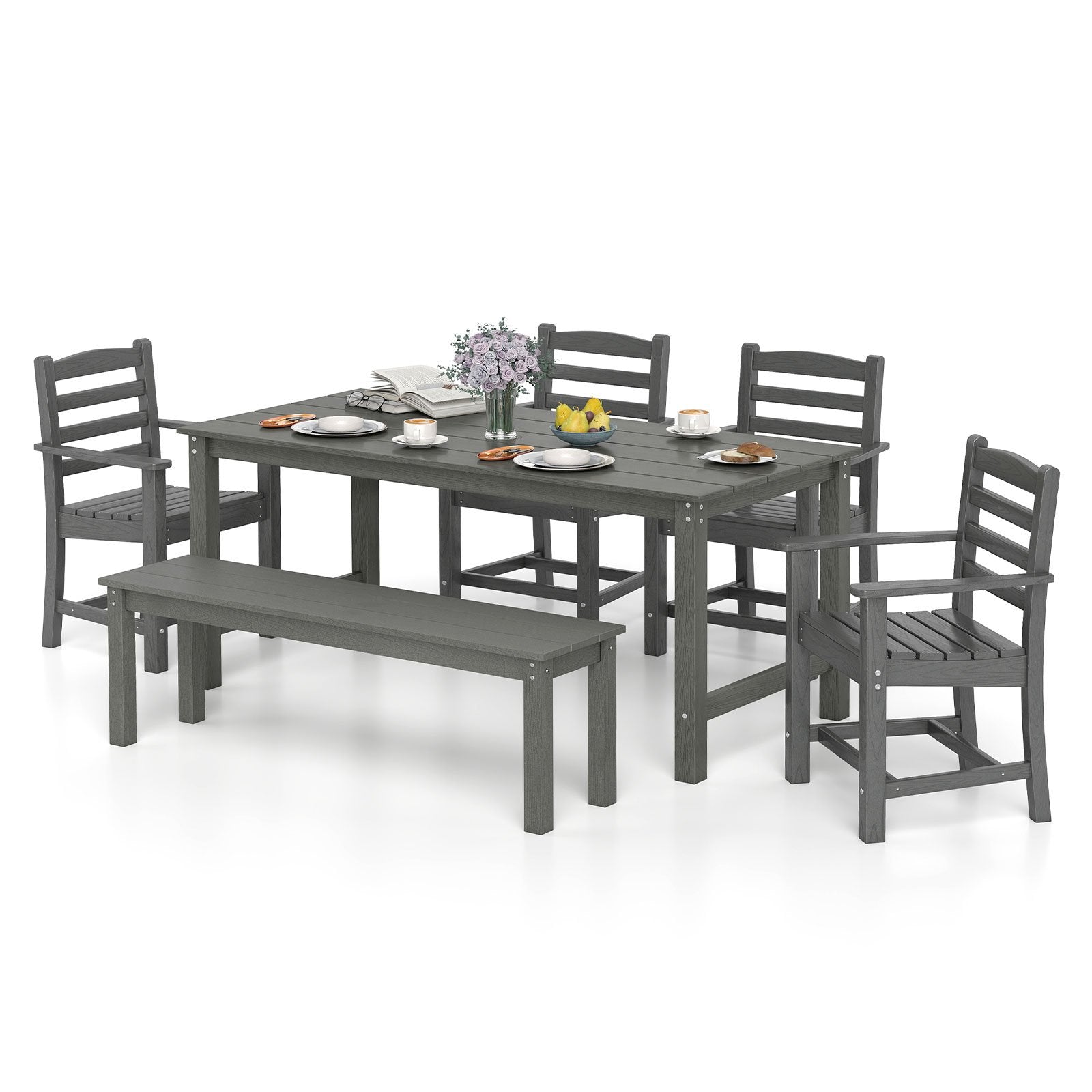 6 Pieces Patio Dining Bench Set Outdoor HDPE Weather Resistant Table and Chairs Set-Black