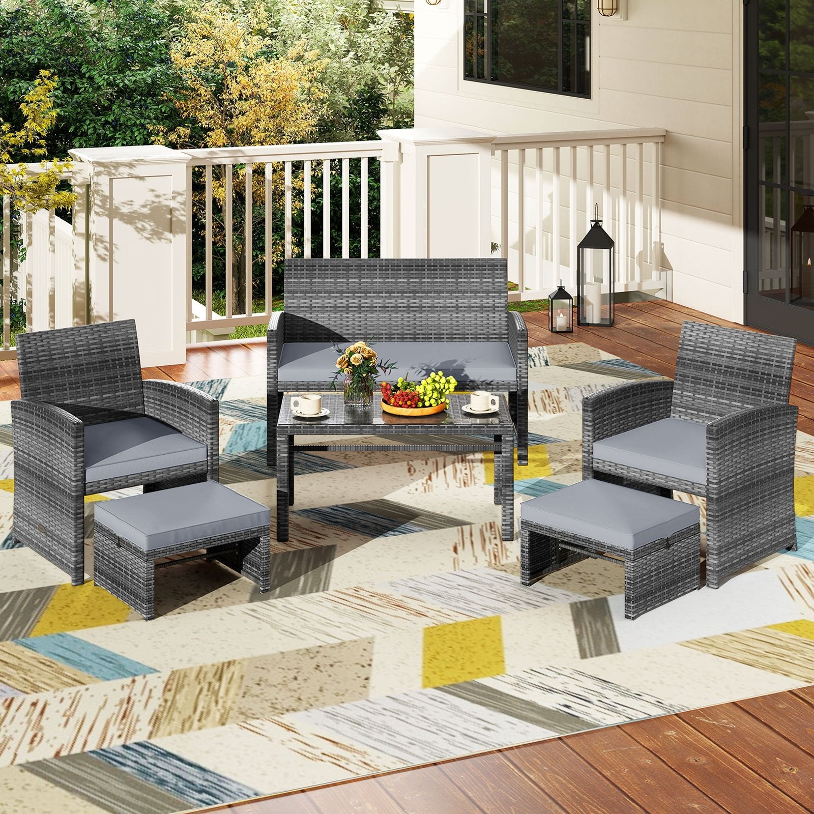 ●Versatile Layouts: This 6-piece outdoor furniture set includes 1 loveseat 1 coffee table 2 armchairs and 2 ottomans which allows you to arrange and rearrange to perfectly complement your patio deck garden or poolside. Please avoid rain exposure for prolonged service life.