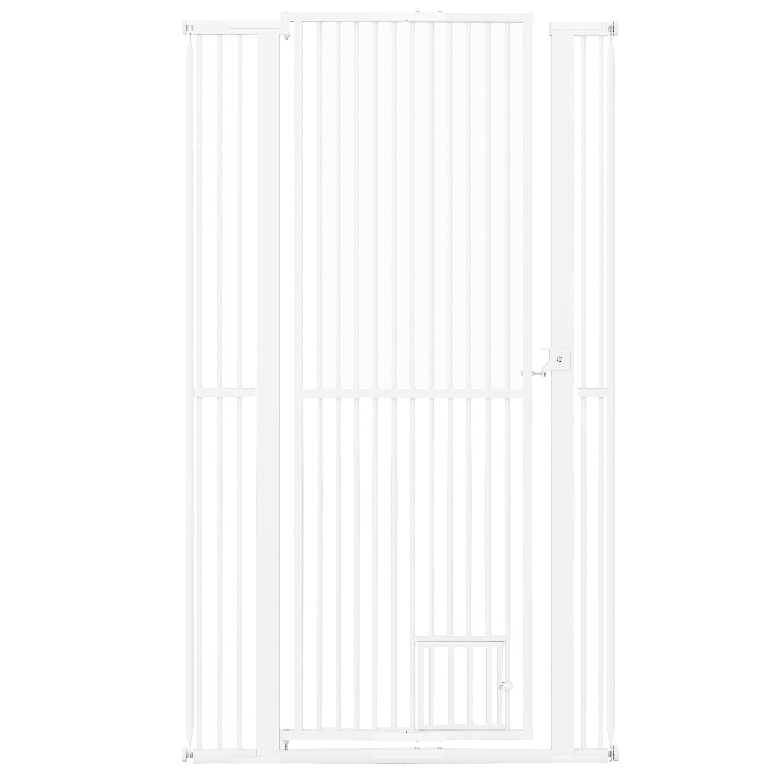 ● Easy Access: The gate features a large main door with a safety lock that swings open from both sides allowing for easy passage. Additionally it includes a lockable small door at the bottom making it convenient for smaller pets to pass through while keeping larger ones contained.