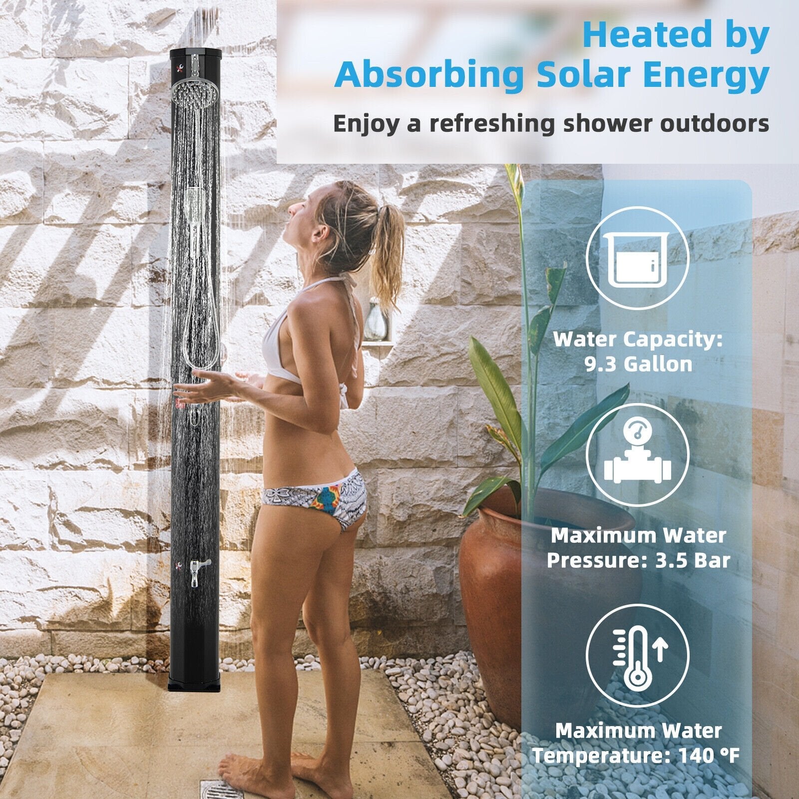 It can hold 9.3 gallons of water and raise the water temperature to 140 °F letting all family members enjoy a comfortable outside shower. Moreover the temperature and water pressure can easily be adjusted by rotating the faucet allowing you to customize it for more comfort. With a hose water inlet connector and a 3/4" male quick connector the solar shower can be connected to a standard garden hose or a G1/2 water hose easily. Besides featuring a 360° rotating shower head a flexible handheld shower head and a foot shower it can meet your multiple needs. Whether enjoying a cooling shower outside on hot summer days having a nice shower after swimming or washing our feet on the beach it can be your perfect choice. Besides we suggest mounting it on cement or other solid outdoor surfaces with 4 anchoring screws for more security and stability.