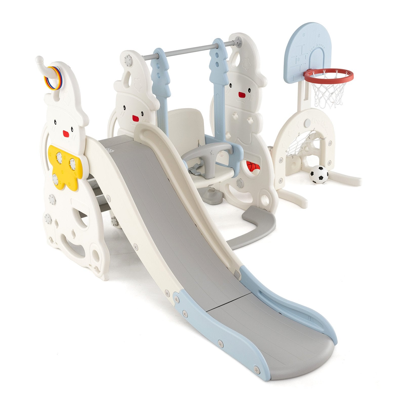 ● 7-in-1 Fun Packed Playset: This toddler indoor playground encompasses a slide swing basketball hoop golf soccer climber and ring toss games. It comes fully equipped with a basketball soccer golf club and golf balls all stored on the included stand along with 3 rings to ensure a tidy play area and endless fun.