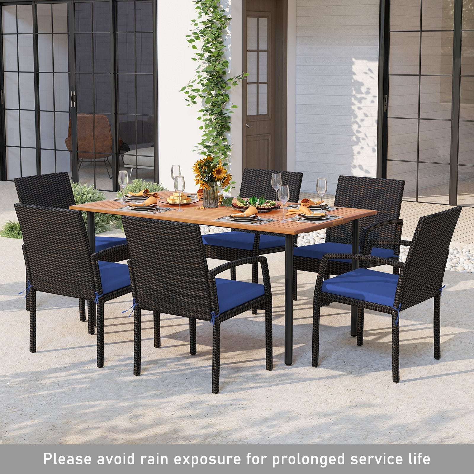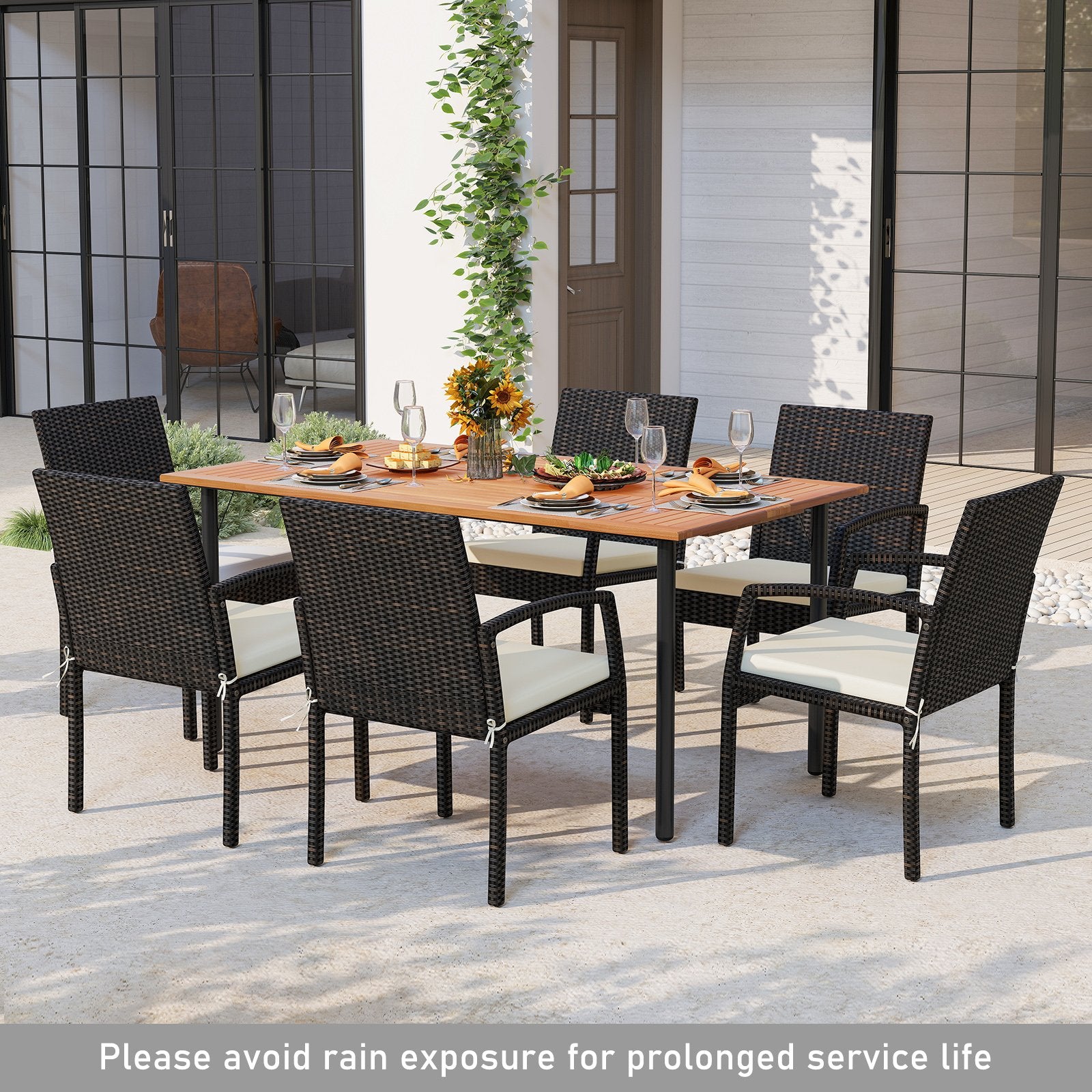 ● All-weather Structure for Outdoor Use: This patio dining set is made of weather-resistant PE wicker and powder-coated steel which has excellent rust resistance and durability to ensure year-round use. And the premium acacia wood table also comes with a 2.16'' umbrella hole for most umbrellas. Besides the slat design of the tabletop can also avoid rainwater accumulation.