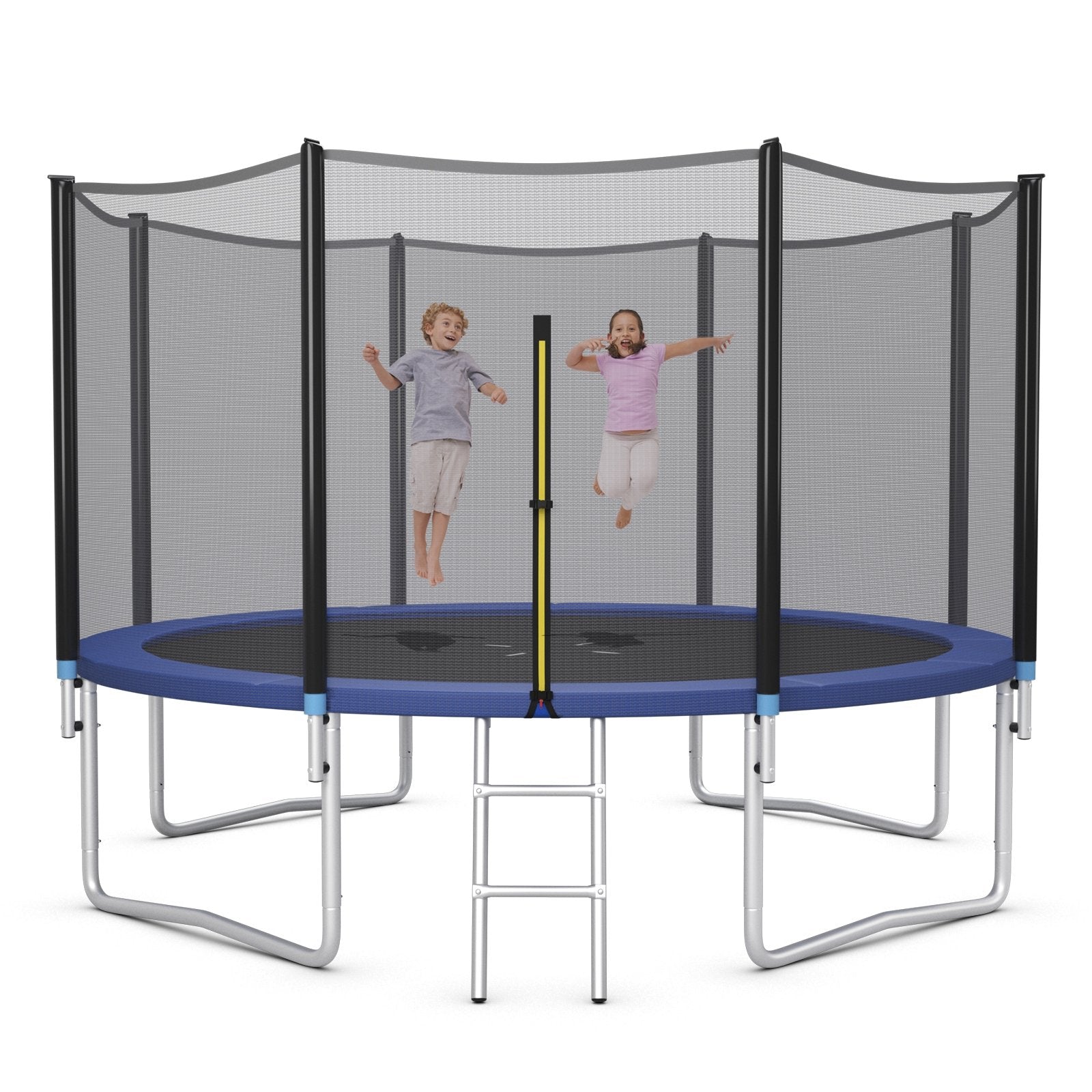 This outdoor trampoline is constructed with a solid and sturdy galvanized steel frame for better resistance to rust and corrosion. And the U-shaped legs provide strong support and strength for long-term use. Besides the jumping mat is made of wear-resistant and ultraviolet-proof PP materials that provide high resilience and it is also connected to the steel pipes with soft foam eliminating the gap between the mat and the net letting your kids play more safely. What's more the enhanced springs are characterized by great bounce and rust resistance. Most importantly this trampolines all comply with ASTM F381 & ASTM F225standard safety providing your kids a safe trampoline experience!