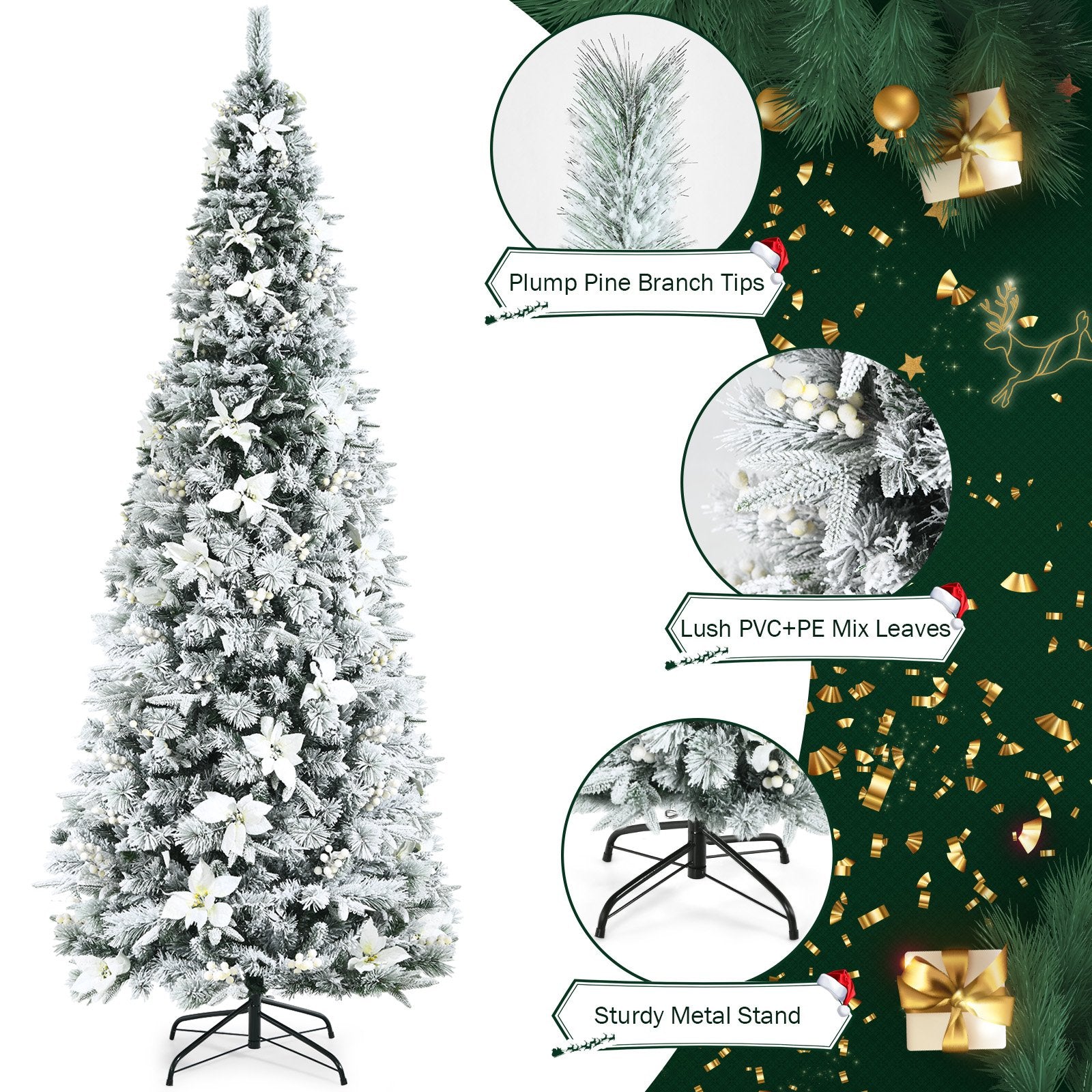 Snow Flocked Christmas Pencil Tree with Berries and Poinsettia Flowers- 8 ft